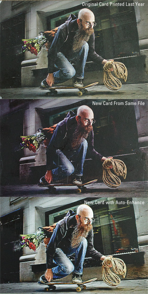 I sent an email into customer support and got into a back and forth with the guy over there. To their credit, they were very prompt and polite. However even though I sent a photo of the two cards sitting next to each other as proof, they guy apparently following a script, proceeded to tell me that my images are too dark and that’s the problem. I’m at fault in other words. Being magnanimous however, he offered to reprint them with their “auto-enhance” process turned on. Something I had, and always, explicitly turn off.