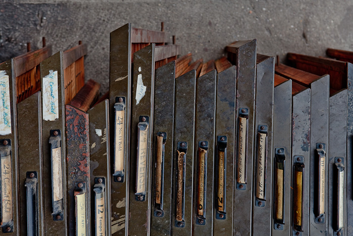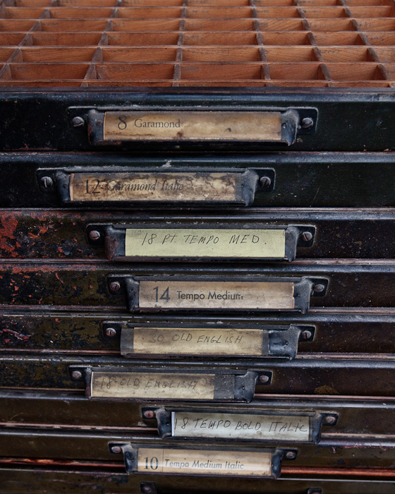 The printing company that’s going out of business after 100 years is at it again. I walked out today to find stacks of type trays out on the sidewalk awaiting a truck to take them away. Ran upstairs, grabbed my camera, and voila