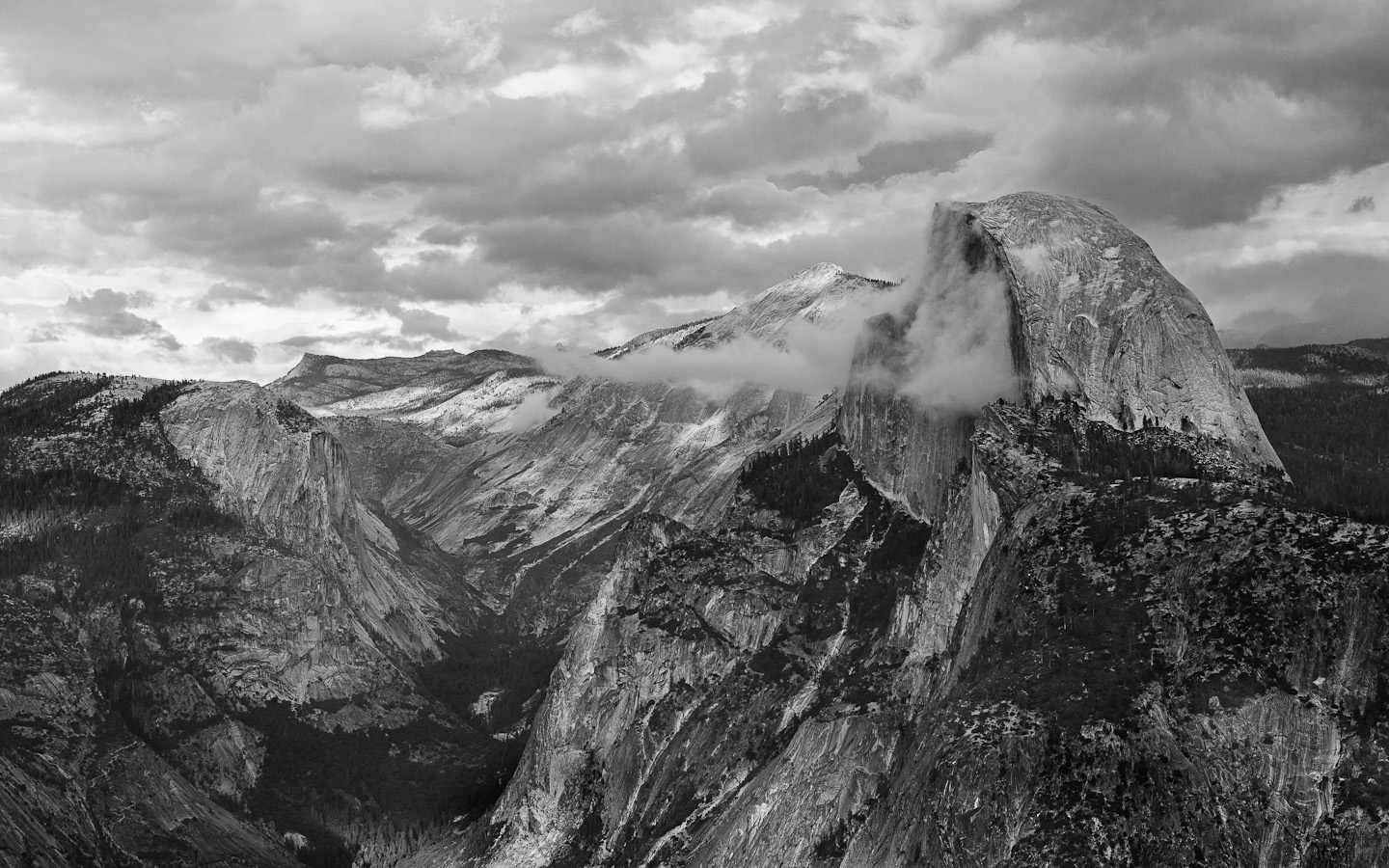 This morning, we found this picture on Heather’s old iPhone. Taken as I was perched precariously on the edge of a 3000 foot cliff (not really, there was a big ledge in front of me) and just moments after I took the picture below (the clouds had slammed into the face of half dome and moved downward by then).